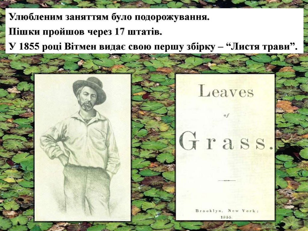 У 1855 році Вітмен видає свою першу збірку – “Листя трави”.