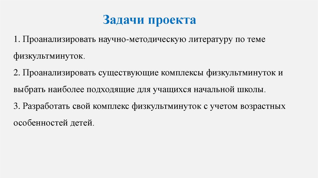 Задачи проекта1. Проанализировать научно-методическую литературу по теме