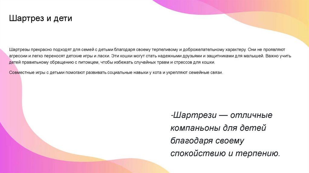 внешний вид и добродушный характер. Шартрезы подходят для семей с детьми, одиноких людей и пожилых, благодаря своей адаптивности и любви к
