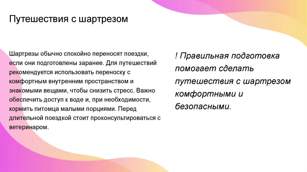 Путешествия с шартрезомШартрезы обычно спокойно переносят поездки,