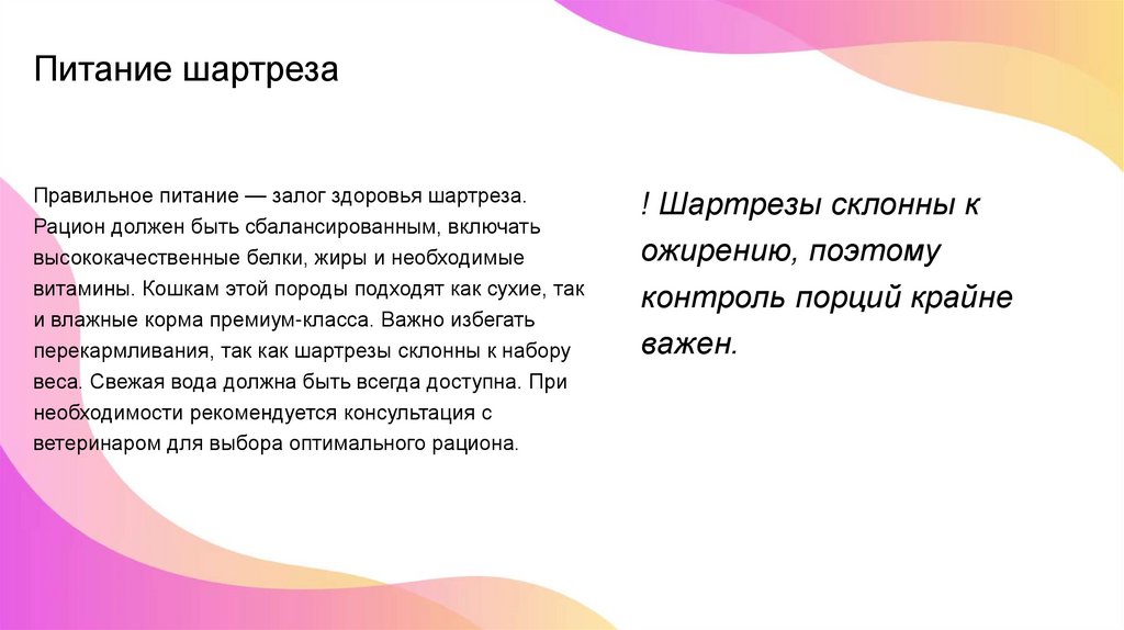 Питание шартрезаПравильное питание — залог здоровья шартреза.