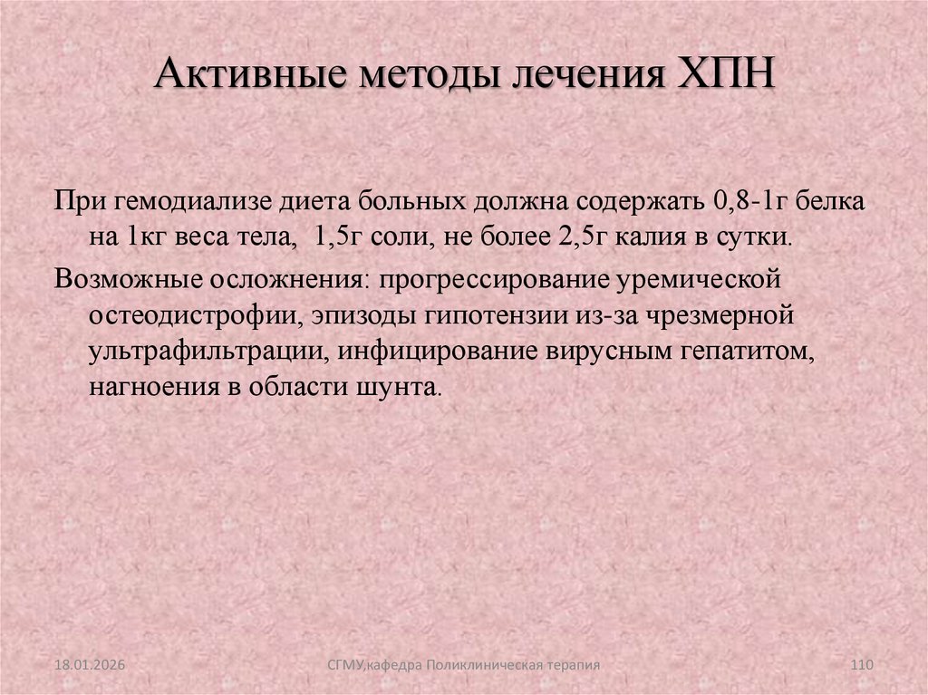 Активные методы лечения ХПНПри гемодиализе диета больных должна содержать 0,8-1г белка