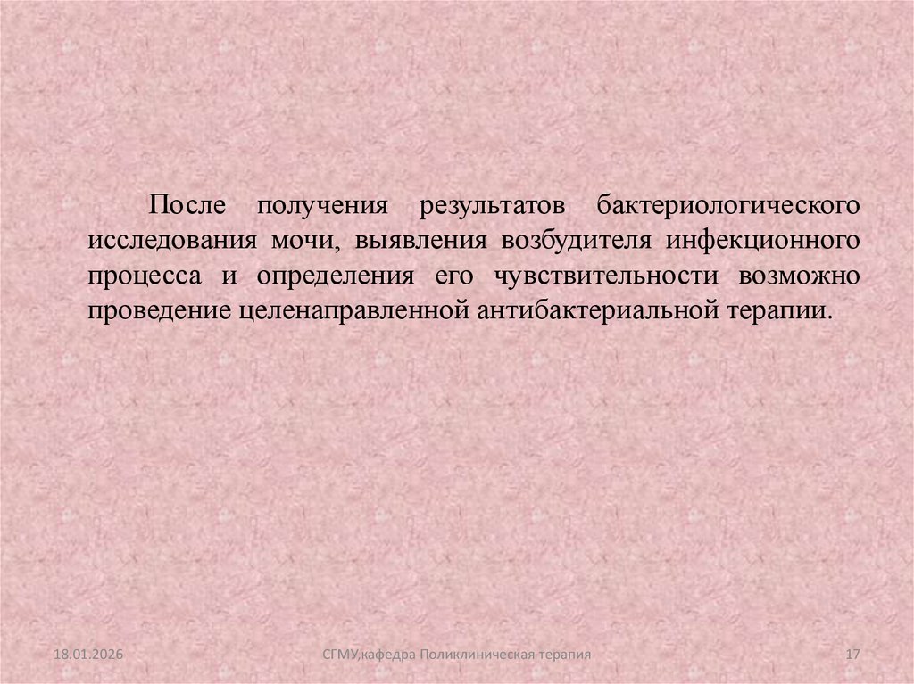 В ситуациях, исключающих возможность ожиданиярезультатов посева мочи, а таковыми являются практически все