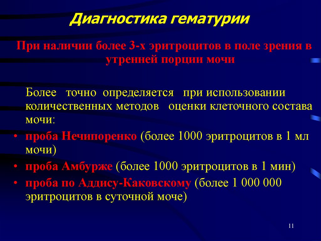 Диагностика гематурииПри наличии более 3-х эритроцитов в поле зрения в