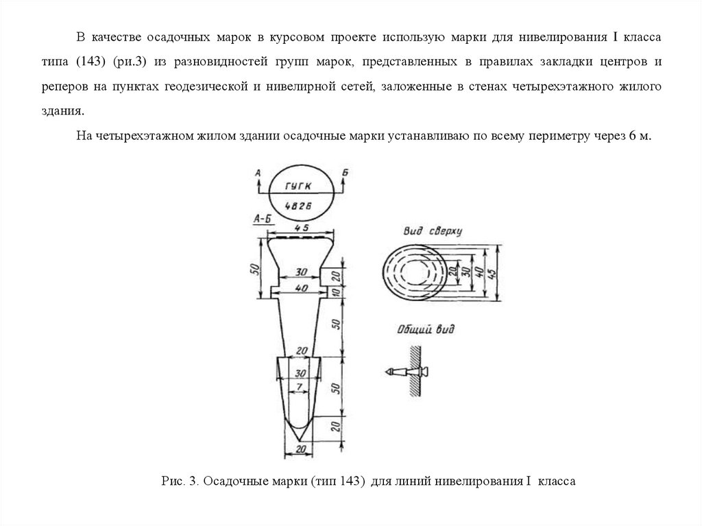 В качестве осадочных марок в курсовом проекте использую марки для нивелирования I классатипа (143) (ри.3) из разновидностей групп марок, представленных в правилах закладки центров и