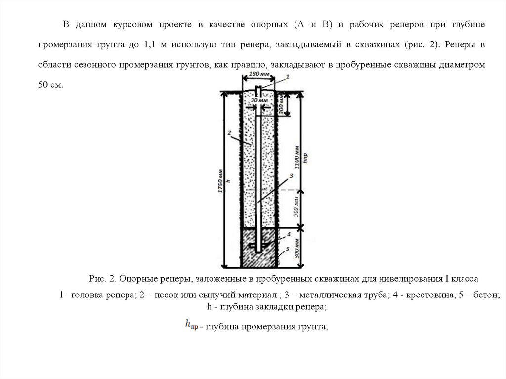 В данном курсовом проекте в качестве опорных (А и В) и рабочих реперов при глубинепромерзания грунта до 1,1 м использую тип репера, закладываемый в скважинах (рис. 2). Реперы в