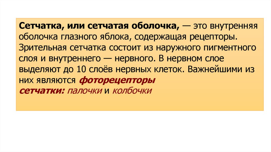 Сетчатка, или сетчатая оболочка, — это внутренняяоболочка глазного яблока, содержащая рецепторы.