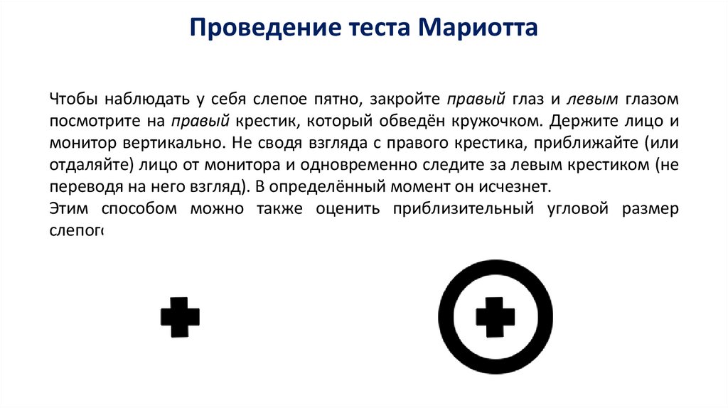 Проведение теста МариоттаЧтобы наблюдать у себя слепое пятно, закройте правый глаз и левым глазом