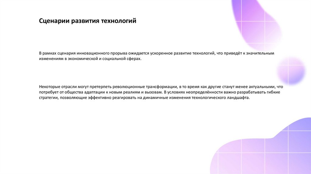 Сценарии развития технологийВ рамках сценария инновационного прорыва ожидается ускоренное развитие технологий, что приведёт к значительным