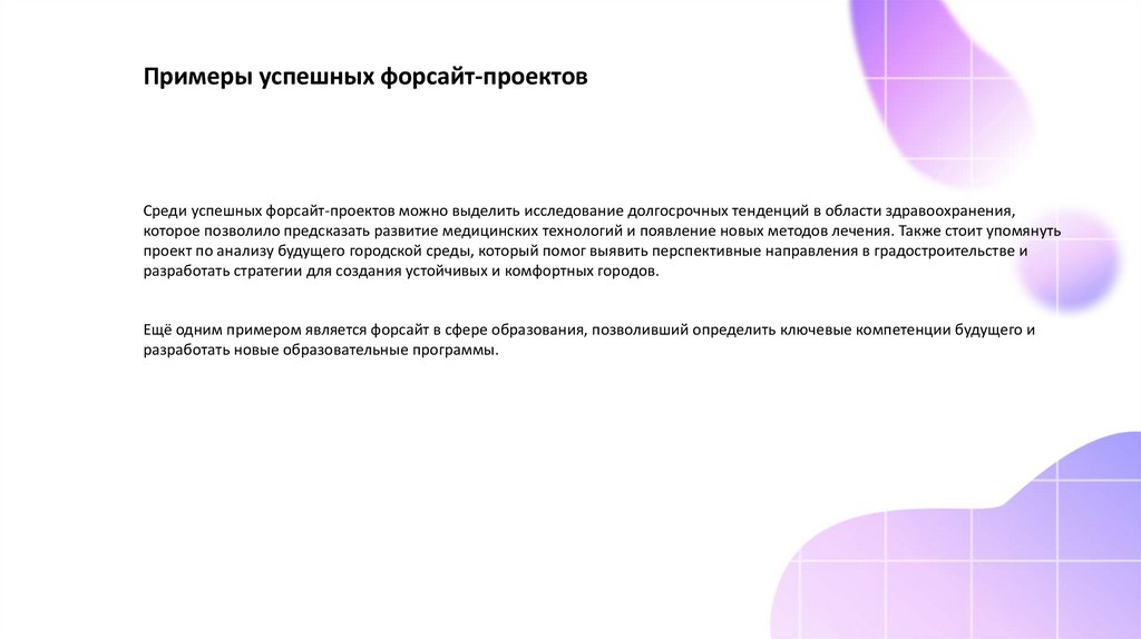 Примеры успешных форсайт-проектовСреди успешных форсайт-проектов можно выделить исследование долгосрочных тенденций в области здравоохранения,