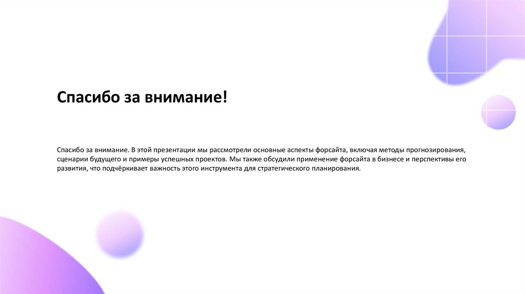 Спасибо за внимание!Спасибо за внимание. В этой презентации мы рассмотрели основные аспекты форсайта, включая методы прогнозирования,