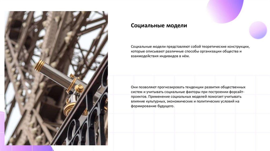 систем и учитывать социальные факторы при построении форсайтпроектов. Применение социальных моделей помогает учитывать