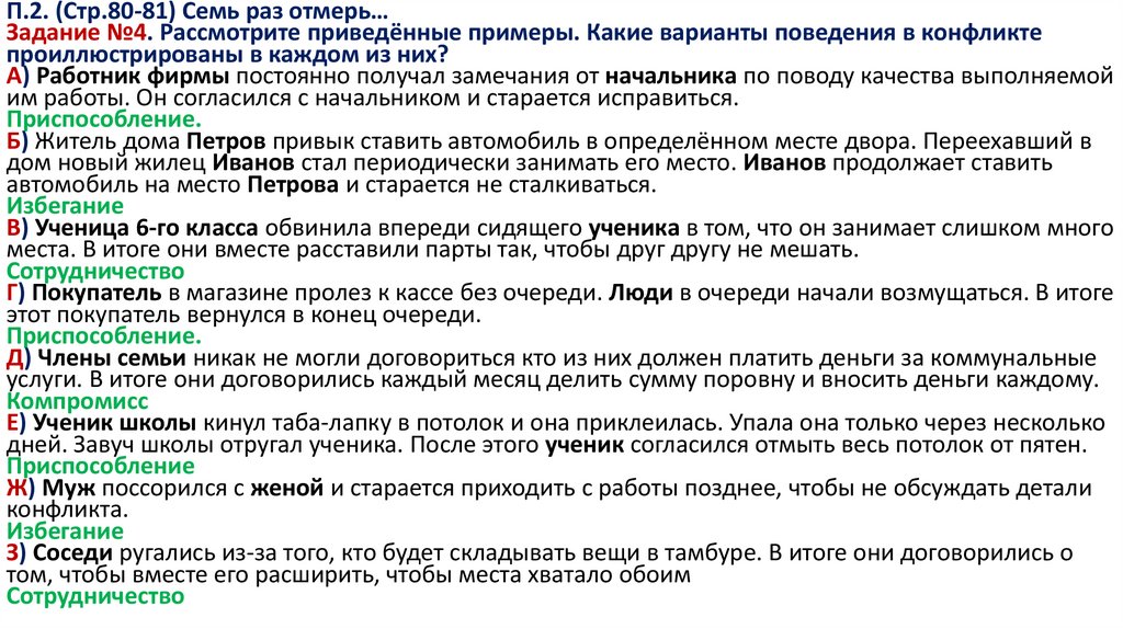 П.2. (Стр.80-81) Семь раз отмерь…Задание №4. Рассмотрите приведённые примеры. Какие варианты поведения в конфликте