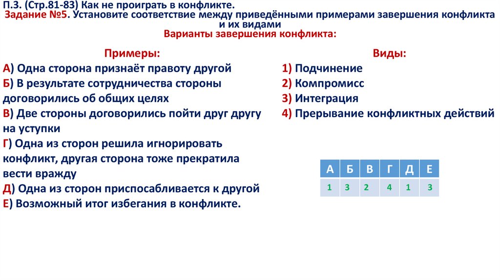 П.3. (Стр.81-83) Как не проиграть в конфликте.Задание №5. Установите соответствие между приведёнными примерами завершения конфликта
