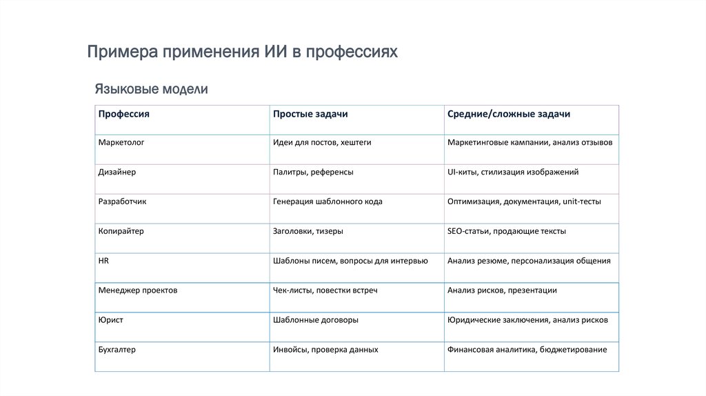 Примера применения ИИ в профессияхЯзыковые модели