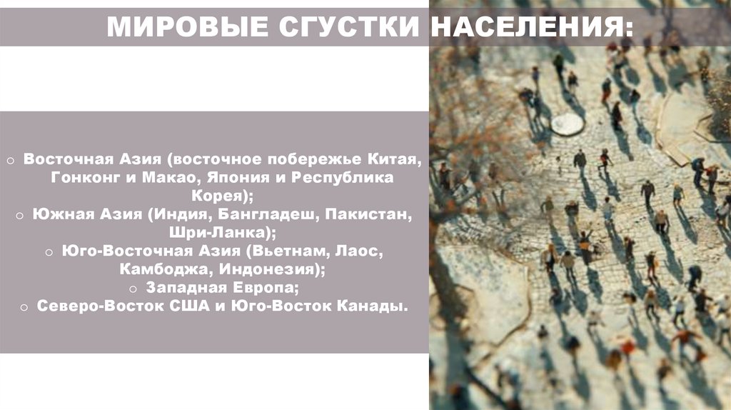 МИРОВЫЕ СГУСТКИ НАСЕЛЕНИЯ:o Восточная Азия (восточное побережье Китая,