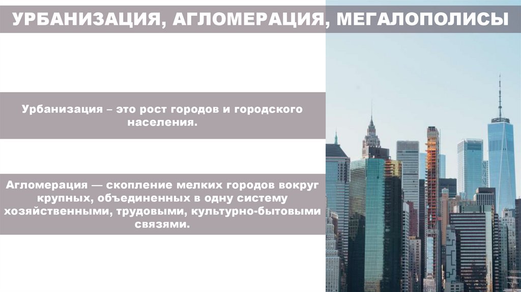 УРБАНИЗАЦИЯ, АГЛОМЕРАЦИЯ, МЕГАЛОПОЛИСЫУрбанизация – это рост городов и городского