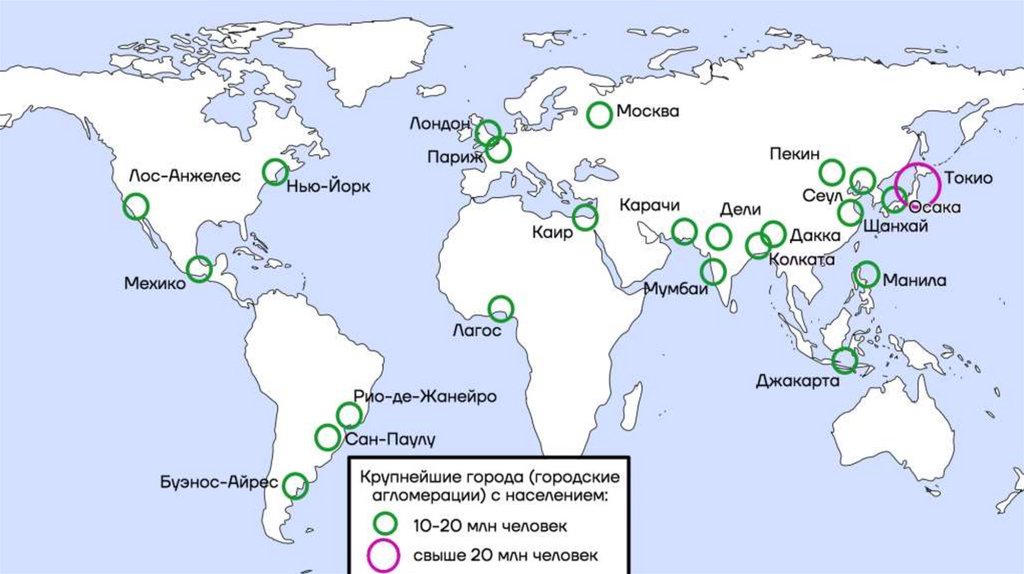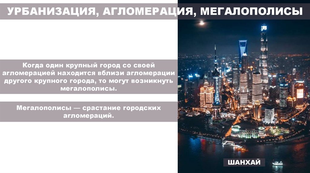 УРБАНИЗАЦИЯ, АГЛОМЕРАЦИЯ, МЕГАЛОПОЛИСЫКогда один крупный город со своей