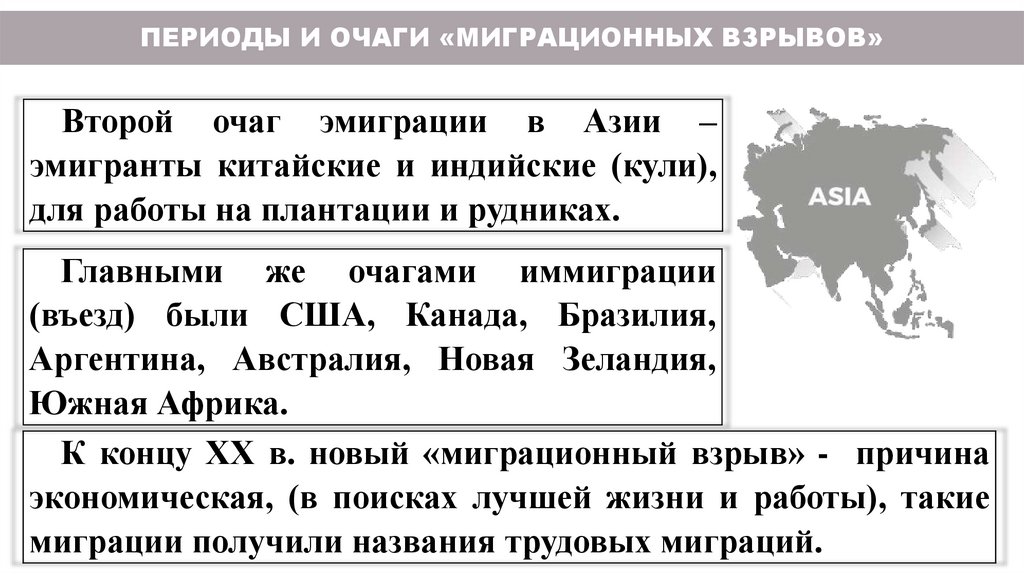 ПЕРИОДЫ И ОЧАГИ «МИГРАЦИОННЫХ ВЗРЫВОВ»Второй очаг эмиграции в Азии –
