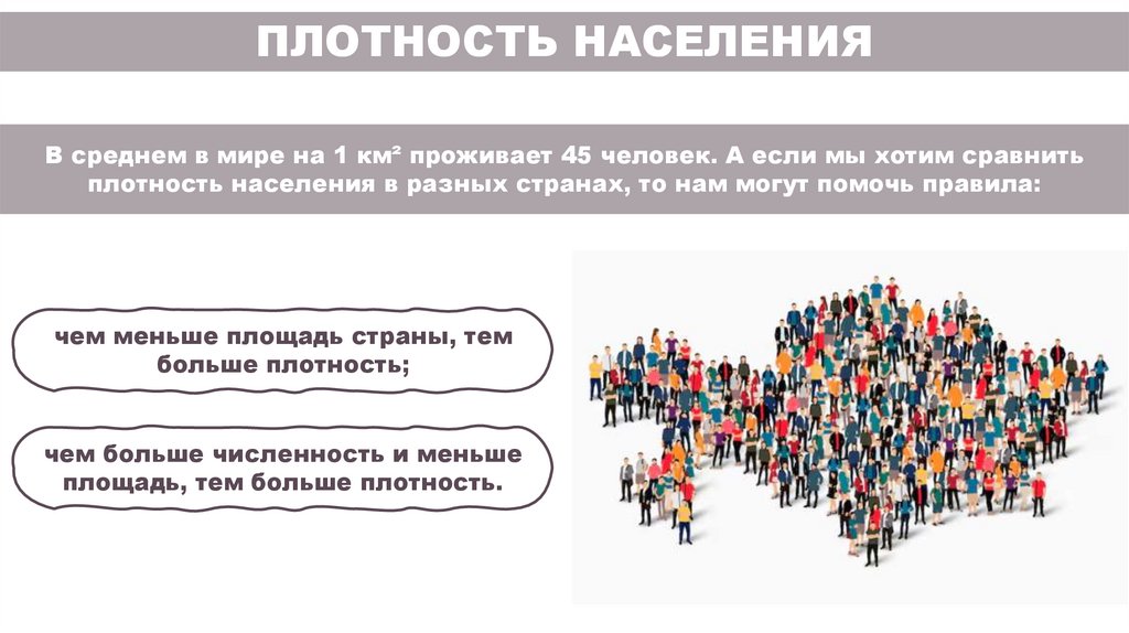 ПЛОТНОСТЬ НАСЕЛЕНИЯВ среднем в мире на 1 км² проживает 45 человек. А если мы хотим сравнить