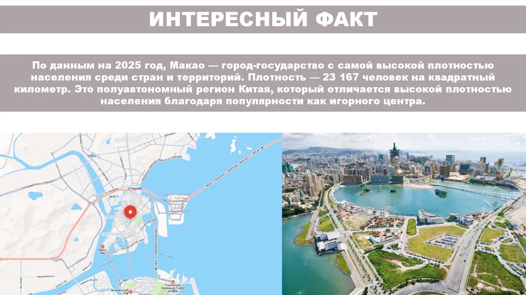 ИНТЕРЕСНЫЙ ФАКТПо данным на 2025 год, Макао — город-государство с самой высокой плотностью