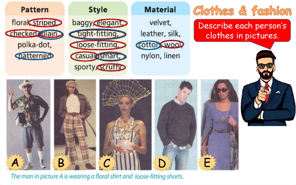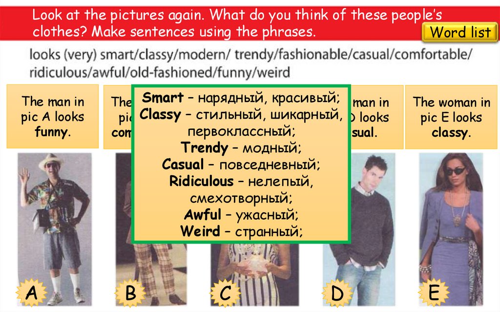 Look at the pictures again. What do you think of these people’sclothes? Make sentences using the phrases.