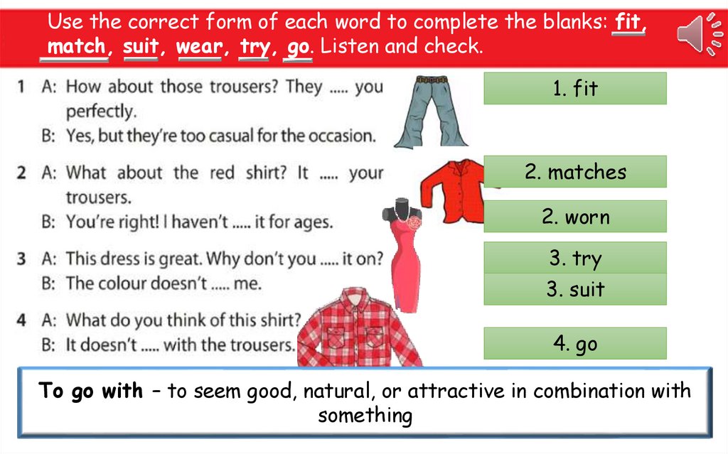 Use the correct form of each word to complete the blanks: fit,match, suit, wear, try, go. Listen and check.