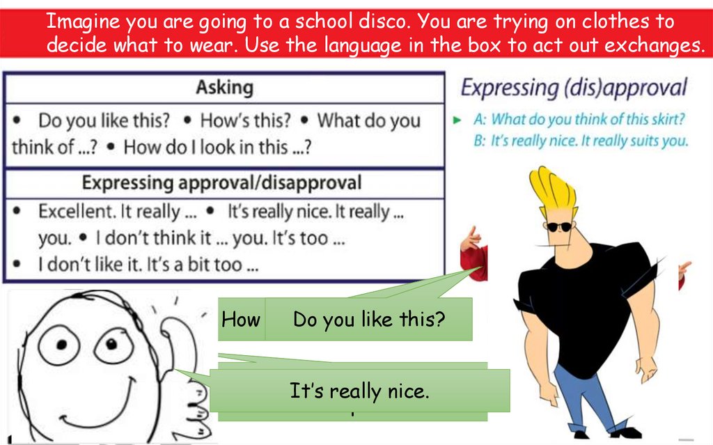 Imagine you are going to a school disco. You are trying on clothes todecide what to wear. Use the language in the box to act out exchanges.