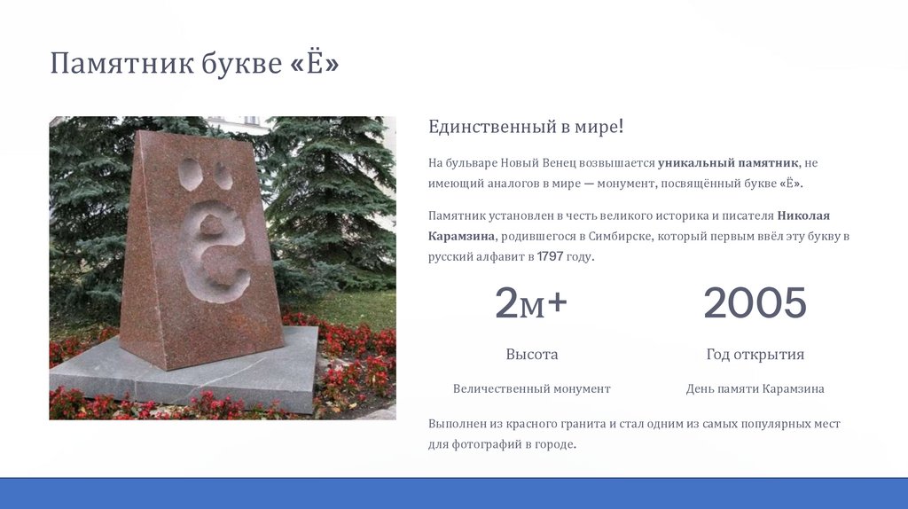 имеющий аналогов в мире — монумент, посвящённый букве «Ё».
