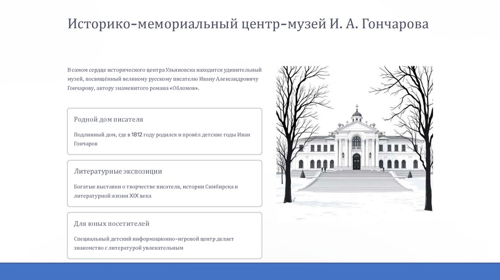 Историко-мемориальный центр-музей И. А. ГончароваВ самом сердце исторического центра Ульяновска находится удивительный