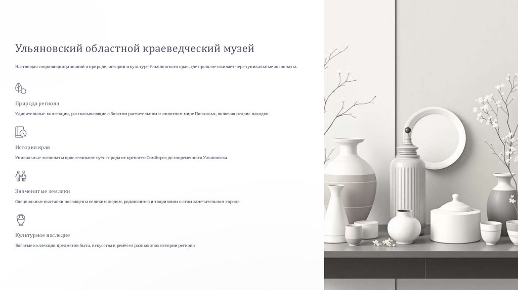Ульяновский областной краеведческий музейНастоящая сокровищница знаний о природе, истории и культуре Ульяновского края, где прошлое оживает через уникальные экспонаты.