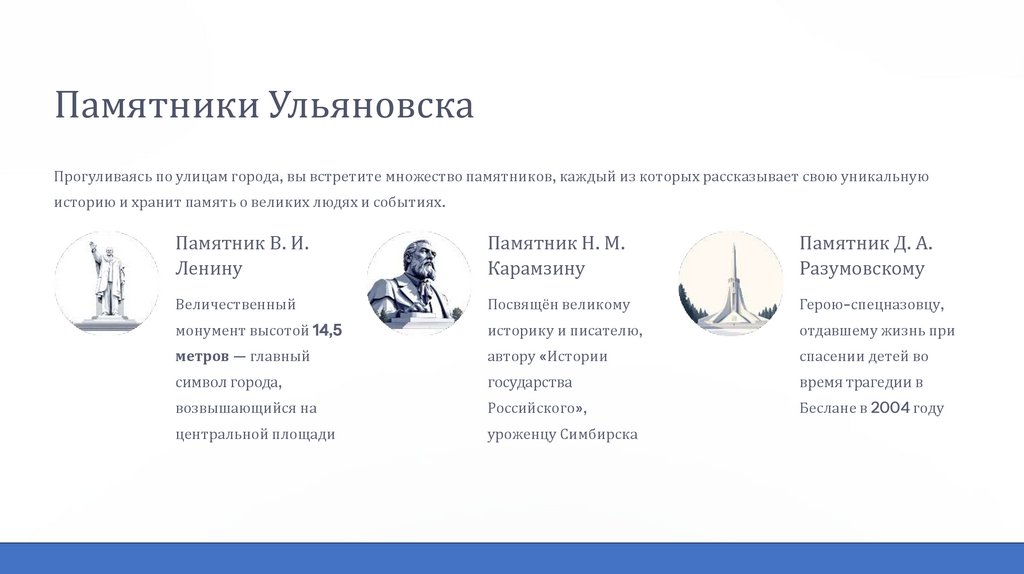 Памятники УльяновскаПрогуливаясь по улицам города, вы встретите множество памятников, каждый из которых рассказывает свою уникальную