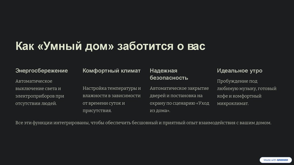 Все эти функции интегрированы, чтобы обеспечить бесшовный и приятный опыт взаимодействия с вашим домом.