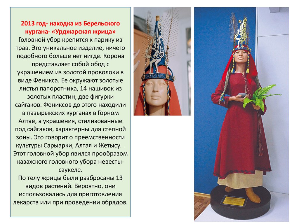 2013 год- находка из Берельскогокургана- «Урджарская жрица»