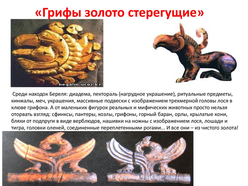 «Грифы золото стерегущие»Среди находок Береля: диадема, пектораль (нагрудное украшение), ритуальные предметы,