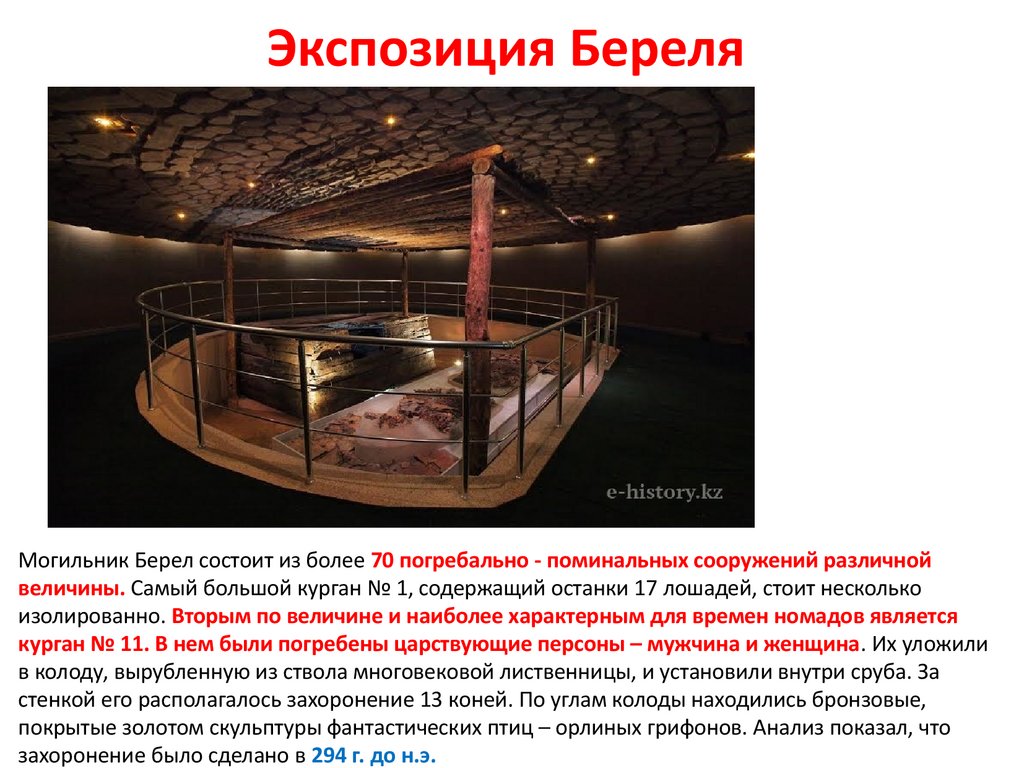 Экспозиция БереляМогильник Берел состоит из более 70 погребально - поминальных сооружений различной