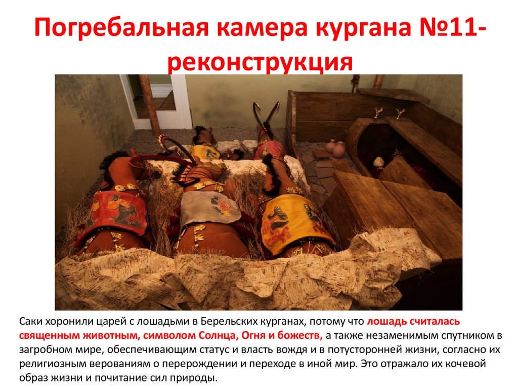 Погребальная камера кургана №11реконструкцияСаки хоронили царей с лошадьми в Берельских курганах, потому что лошадь считалась