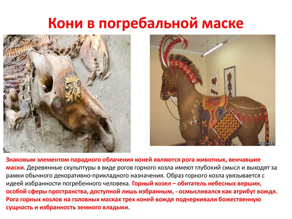 Кони в погребальной маскеЗнаковым элементом парадного облачения коней являются рога животных, венчавшие