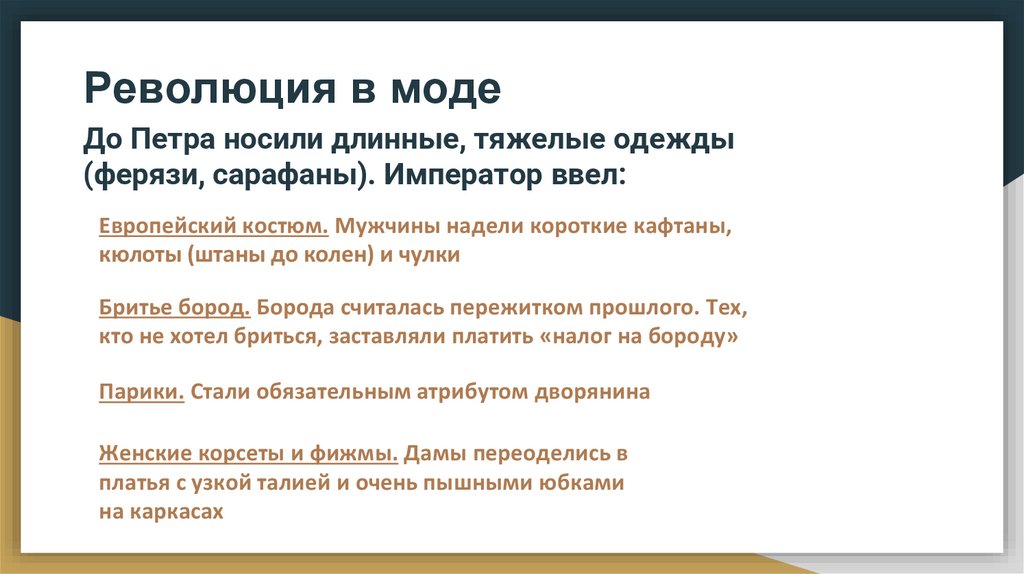 Революция в модеДо Петра носили длинные, тяжелые одежды