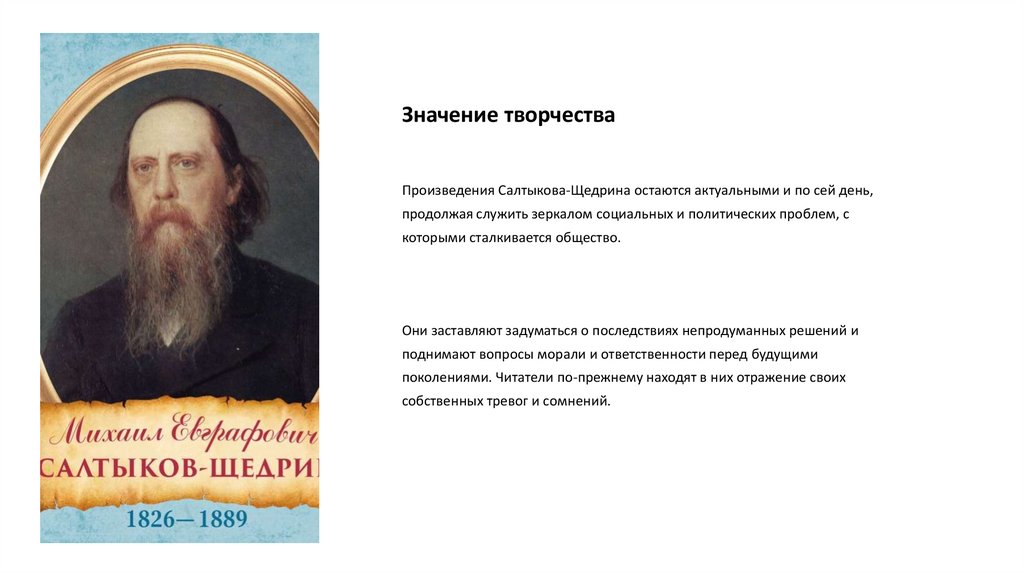 Значение творчестваПроизведения Салтыкова-Щедрина остаются актуальными и по сей день,