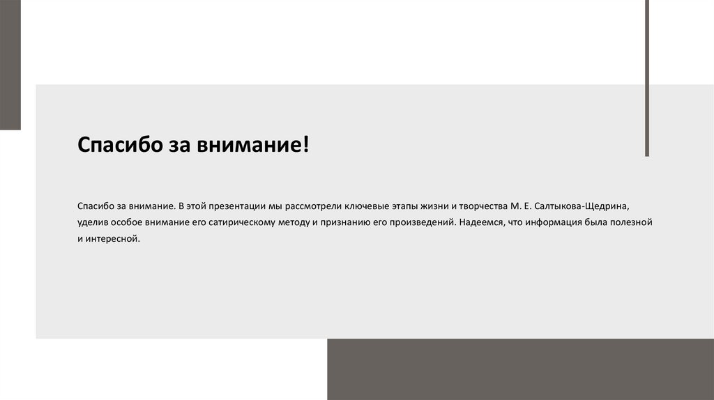 Спасибо за внимание!Спасибо за внимание. В этой презентации мы рассмотрели ключевые этапы жизни и творчества М. Е. Салтыкова-Щедрина,