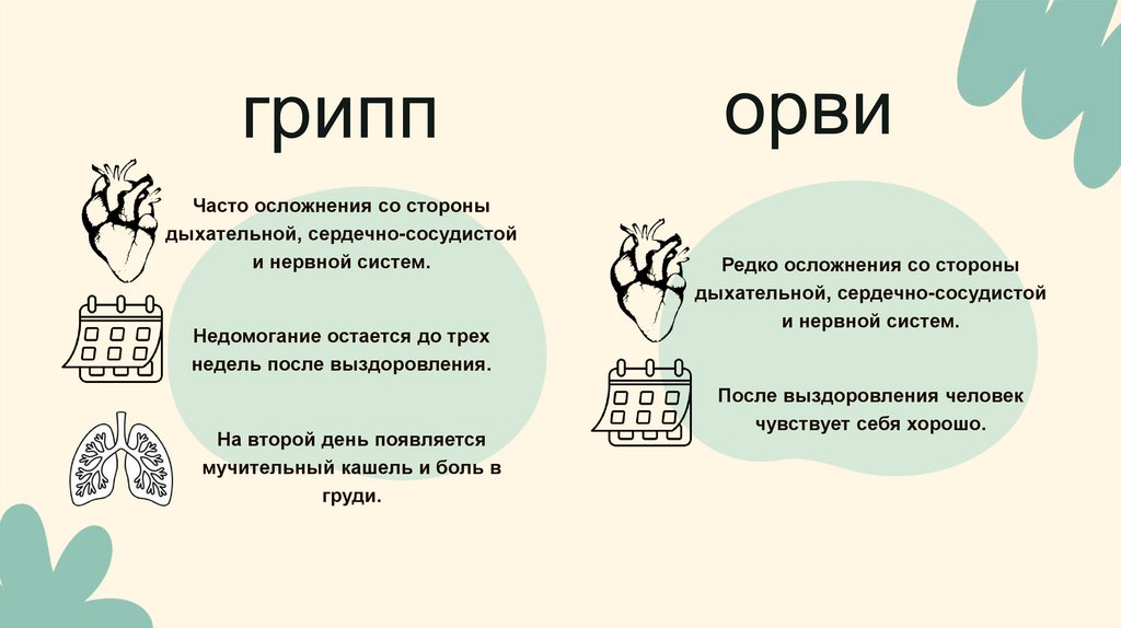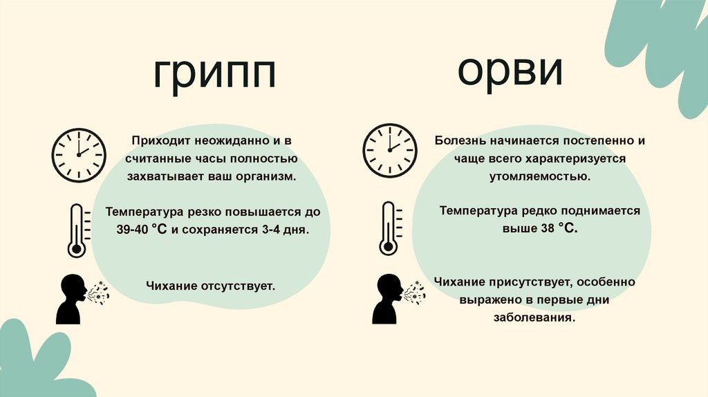 так ярко ощущаются, как при гриппе. Симптомы гриппа: высокая температура,