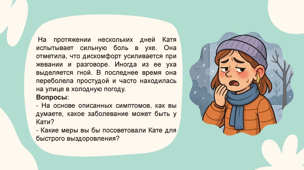 На протяжении нескольких дней Катяиспытывает сильную боль в ухе. Она