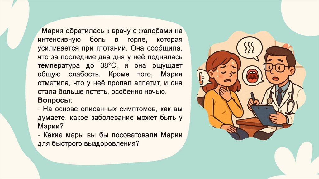Мария обратилась к врачу с жалобами наинтенсивную боль в горле, которая