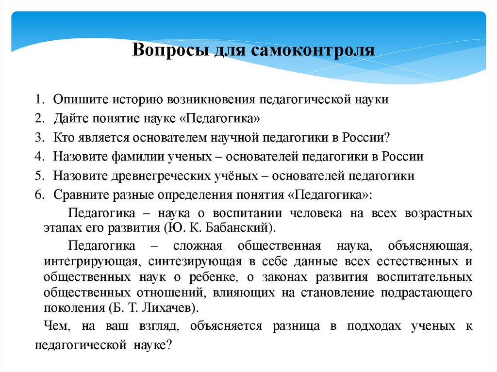 Вопросы для самоконтроля1. Опишите историю возникновения педагогической науки