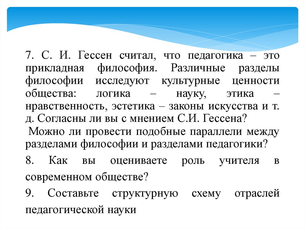 7. С. И. Гессен считал, что педагогика – этоприкладная философия. Различные разделы