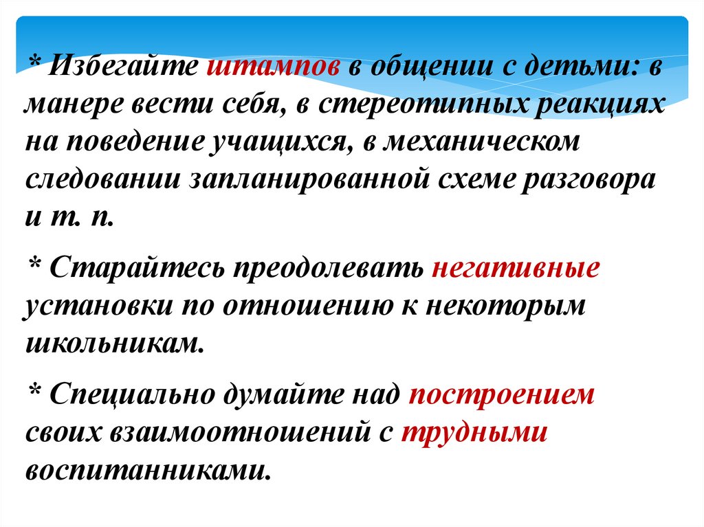 * Избегайте штампов в общении с детьми: вманере вести себя, в стереотипных реакциях