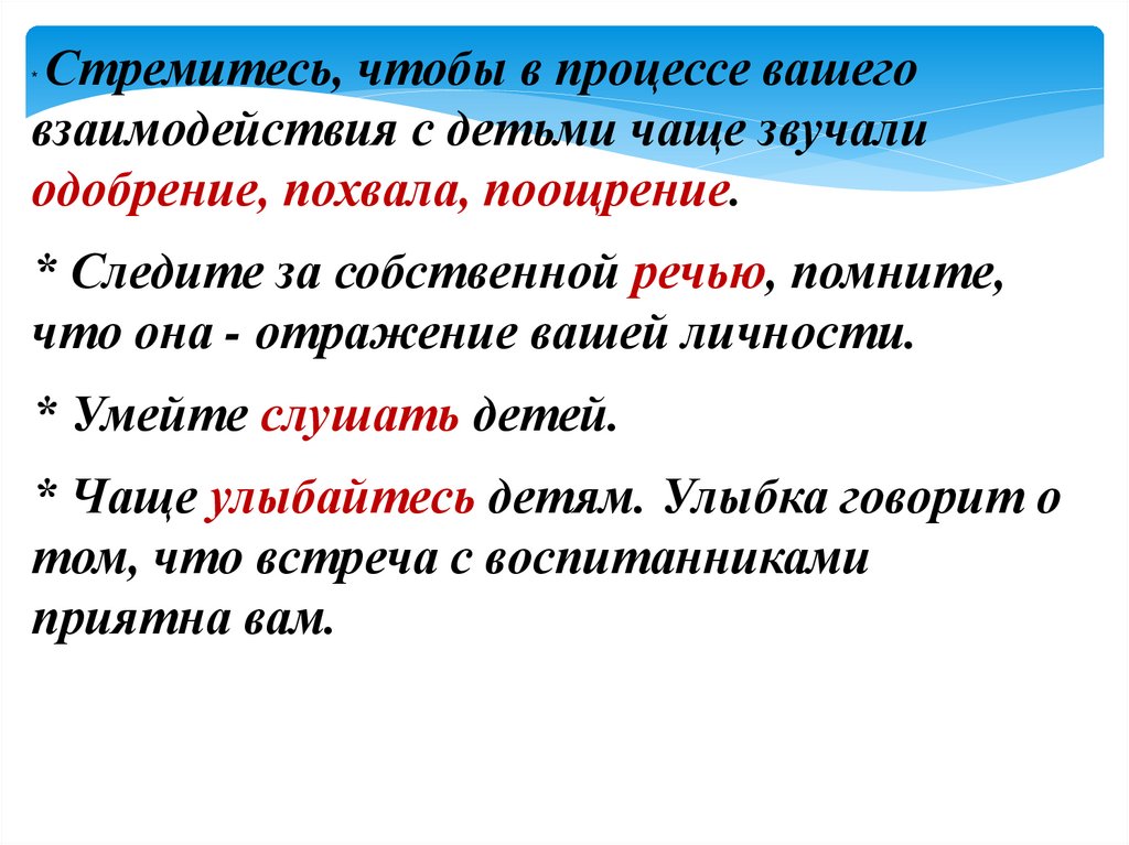 Стремитесь, чтобы в процессе вашеговзаимодействия с детьми чаще звучали