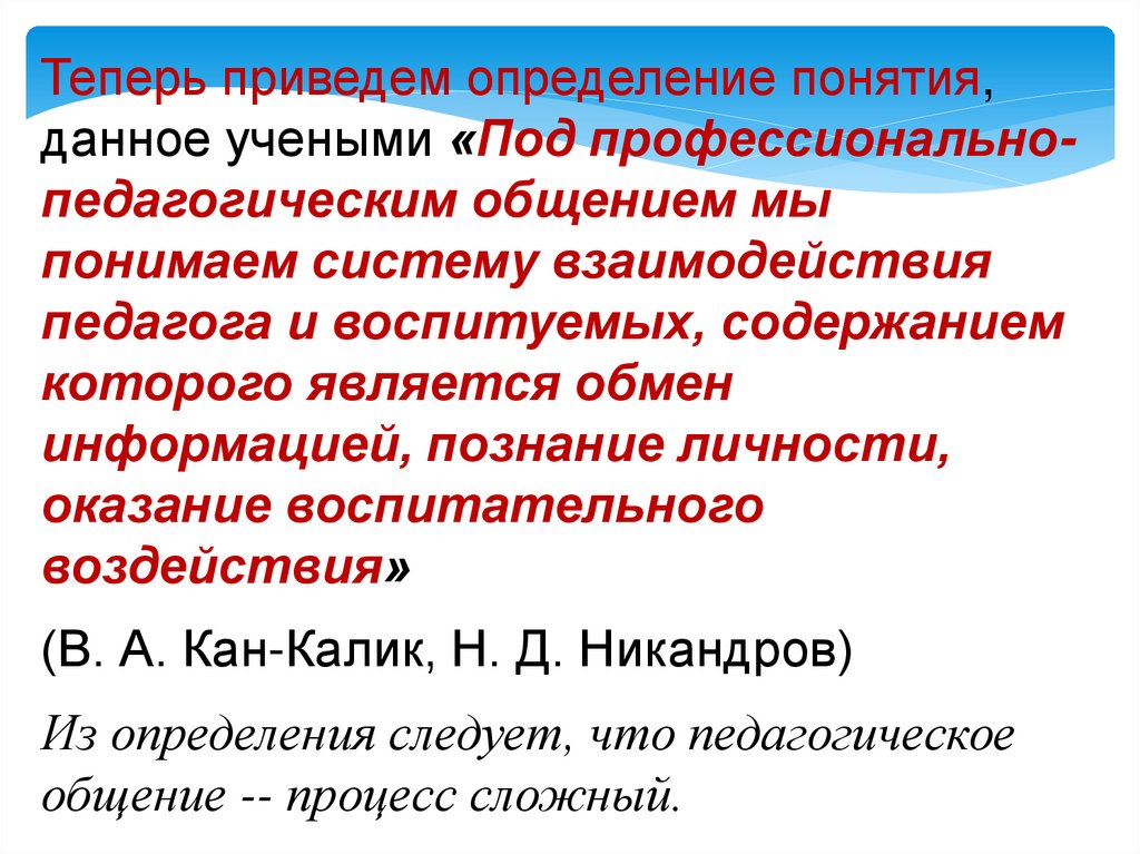 Теперь приведем определение понятия,данное учеными «Под профессиональнопедагогическим общением мы