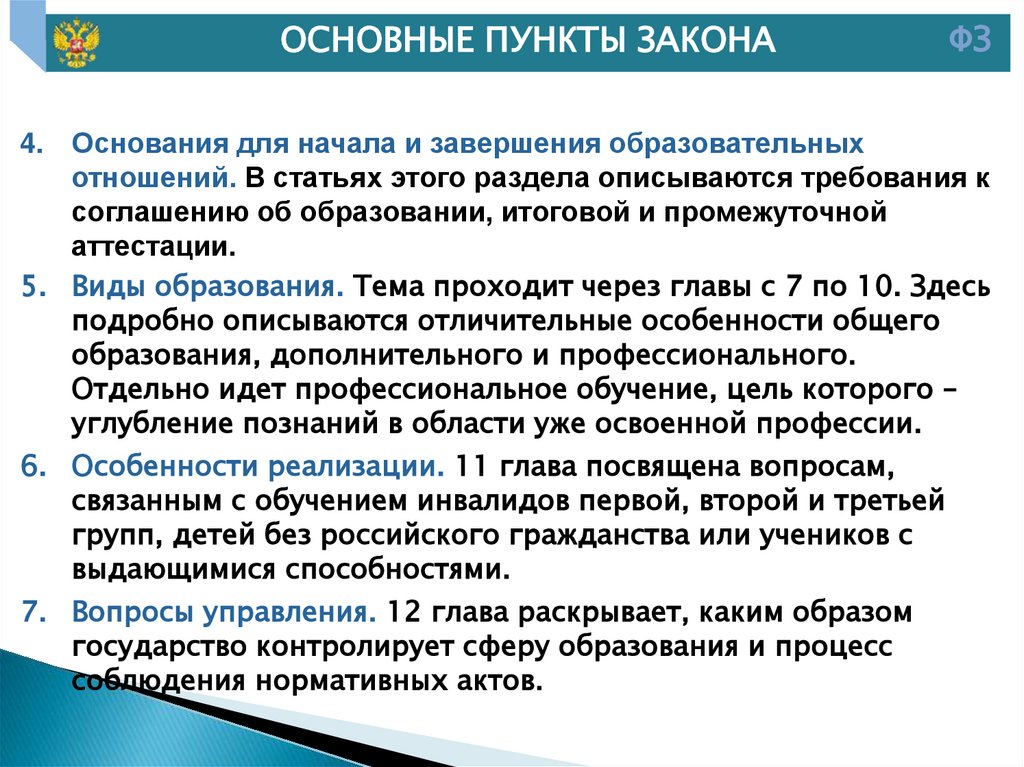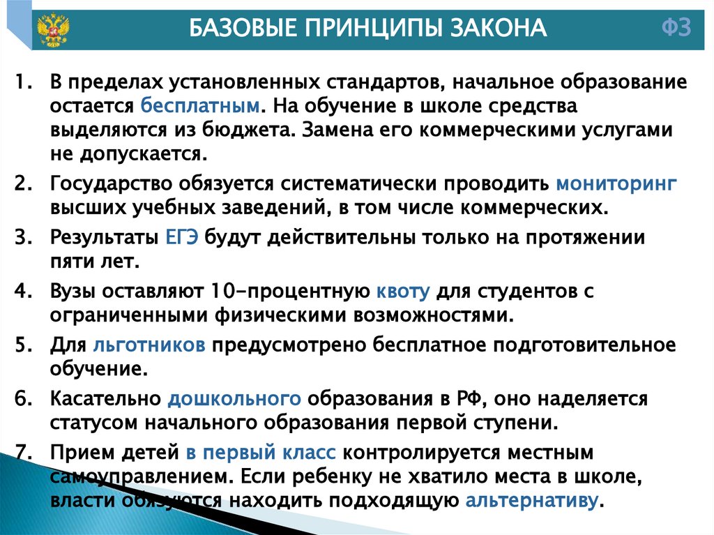 7. Основные положения федерального закона «Об образовании в Российской Федерации» от 29.12.2012 г. № 273-ФЗ: